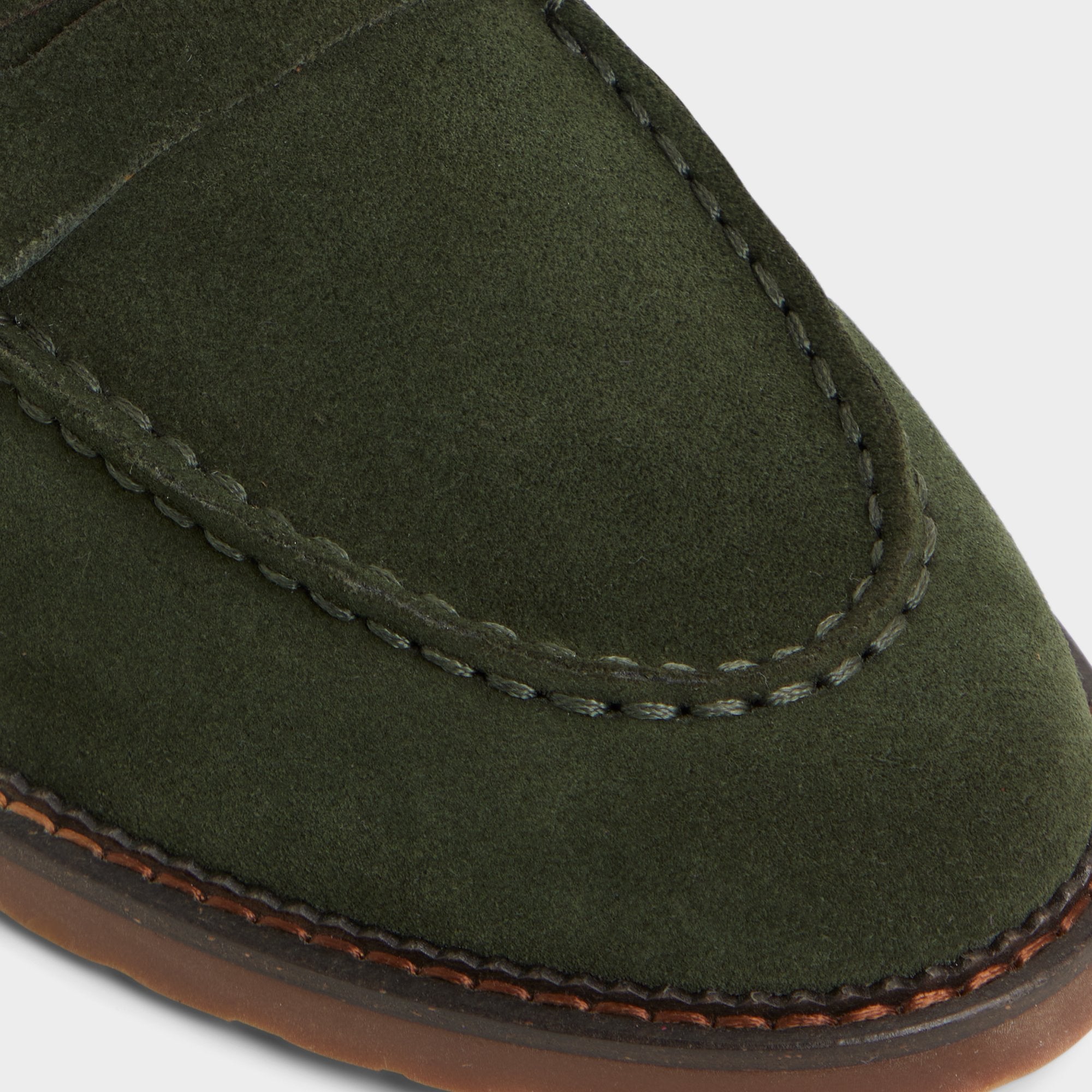 Forest-green suede wraps this penny loafer in confidence. with a rubber lug sole that grips under a tailored silhouette. keeping the look through office hours and after-hours wanderings. no matter the weather. Pair it with cuffed denim for casual brainstorms or with a navy seersucker suit for outdoor weddings.