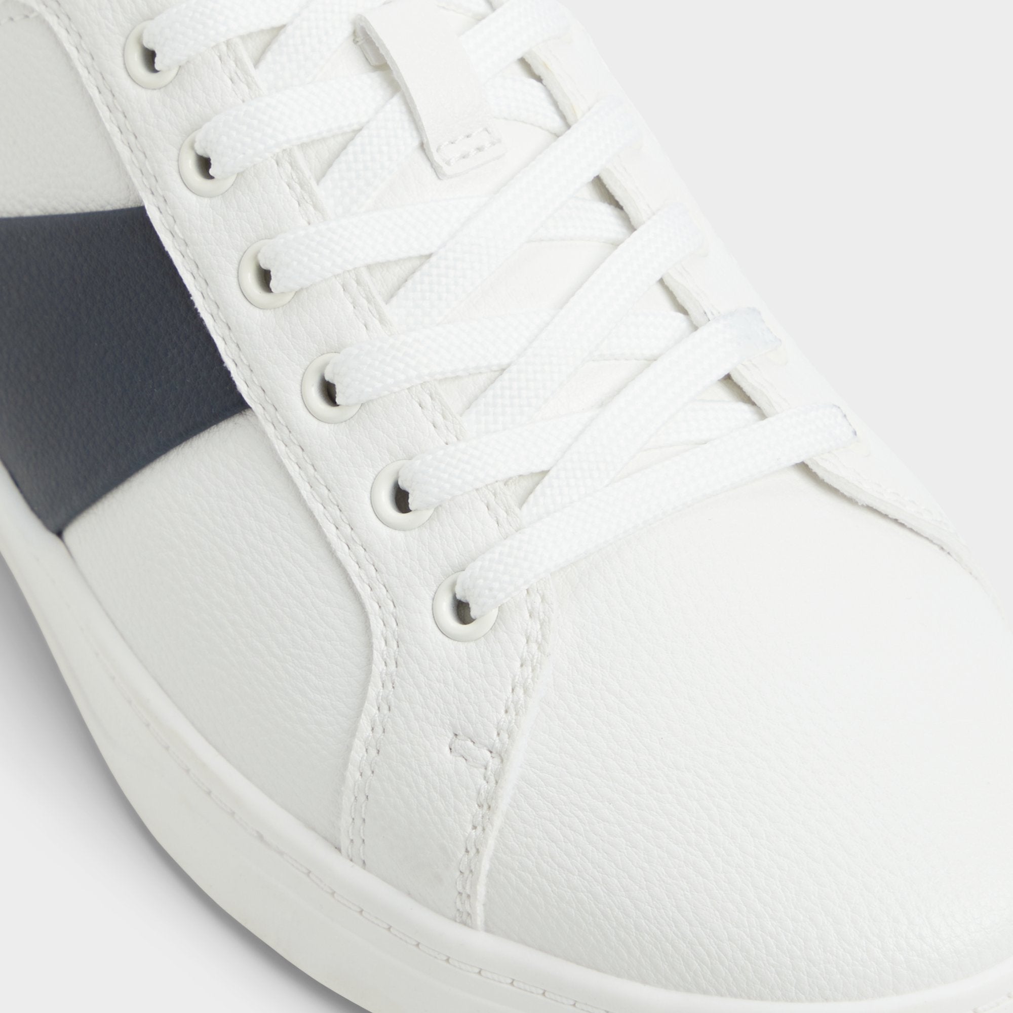 Navy panel cuts across smooth white synthetic leather. adding varsity energy. while metallic eyelets and a lightweight rubber sole keep these low-tops breathable from desk escapes to bar patios. Anchor slim chinos for brainstorm sessions or roll with faded denim on weekend brunch. the color-block stays sharp.