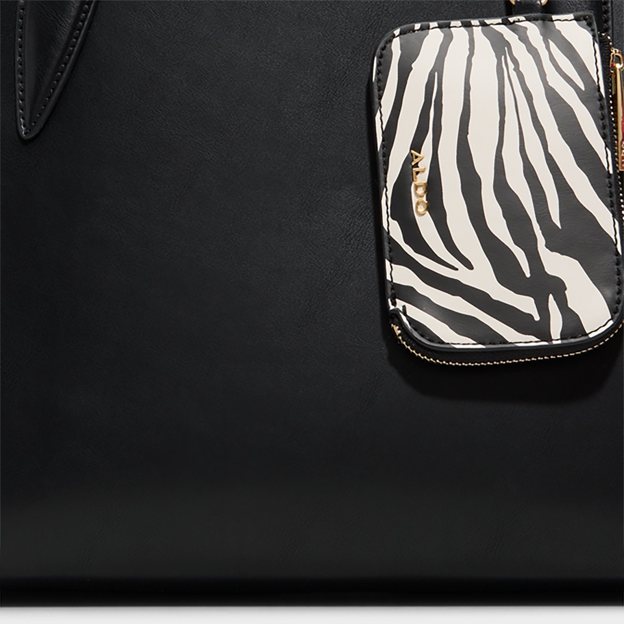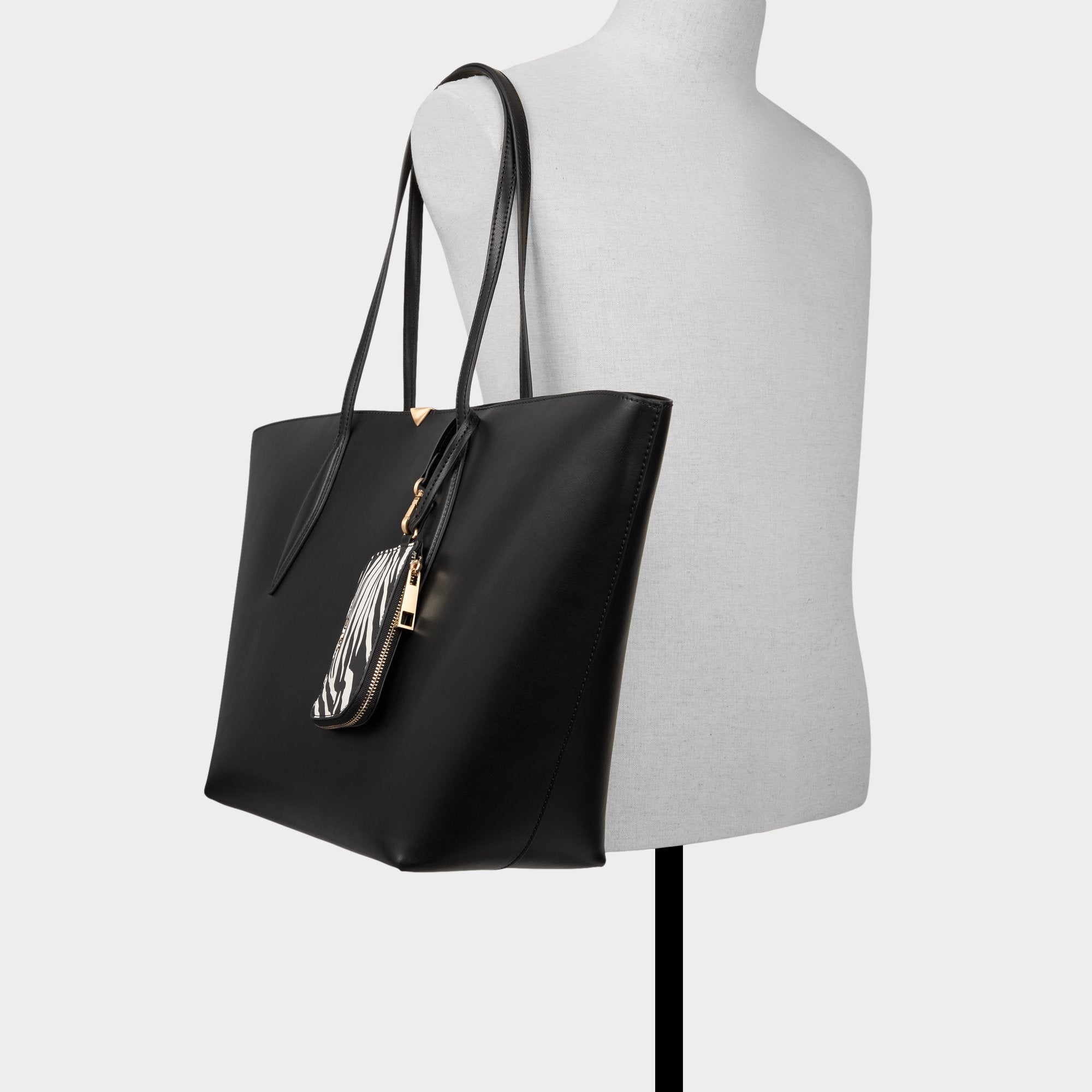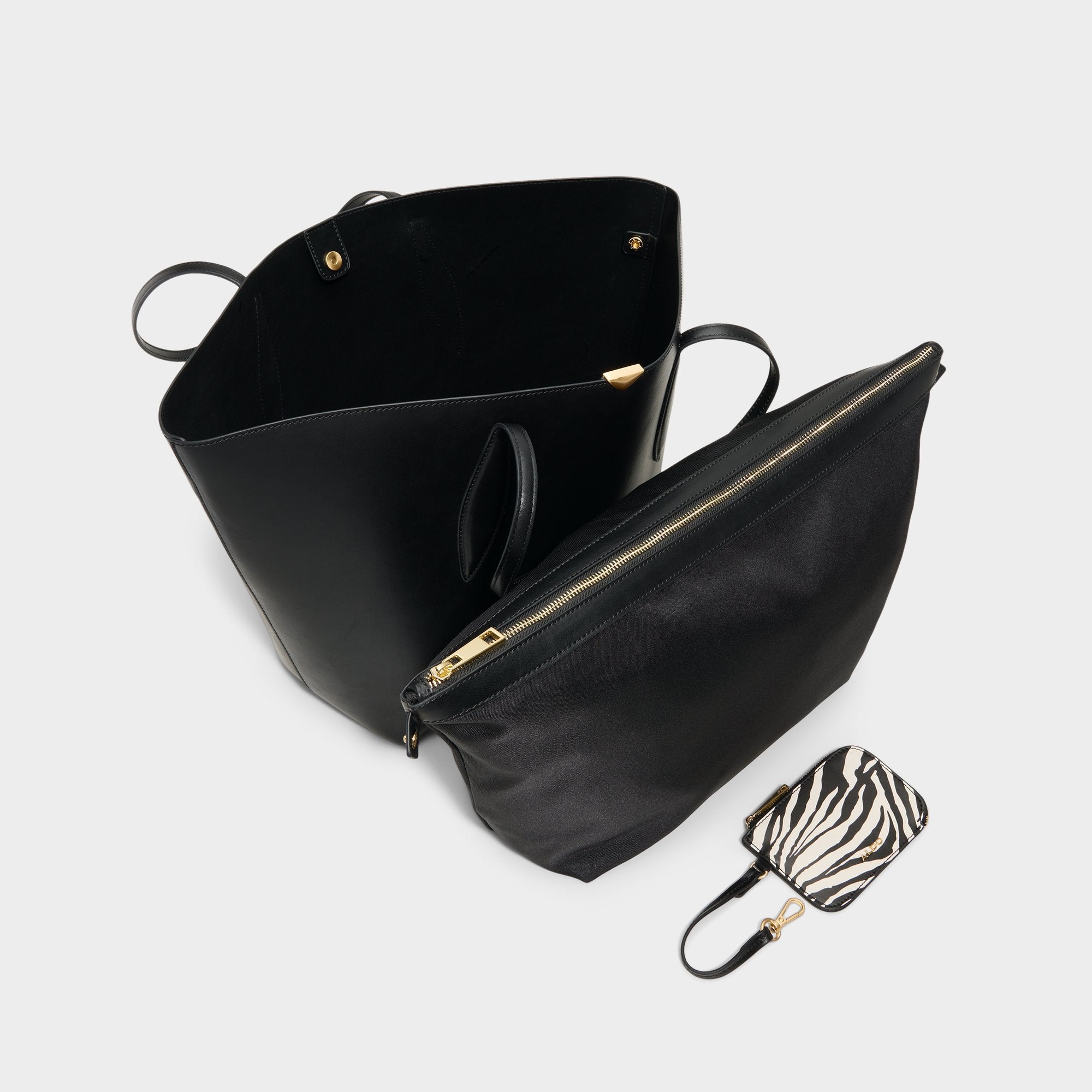 Jet-black leather pairs with a removable zebra-print pouch. giving this roomy tote a bold everyday edge with streamlined shoulder straps and gold-triangle hardware. Carry it with a crisp blazer for office coffee runs. or sling it over weekend knits and leggings to pull everything together.